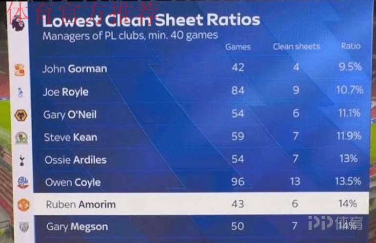 英超“零封率最低”教练榜背后 进攻哲学还是防守短板 当一份“英超零封率最低教练榜”在社交媒体上流传时,阿莫林以43场仅6场零封、零封率约14%的成绩位列历史第7低,立刻成为讨论焦点。数字本身冰冷